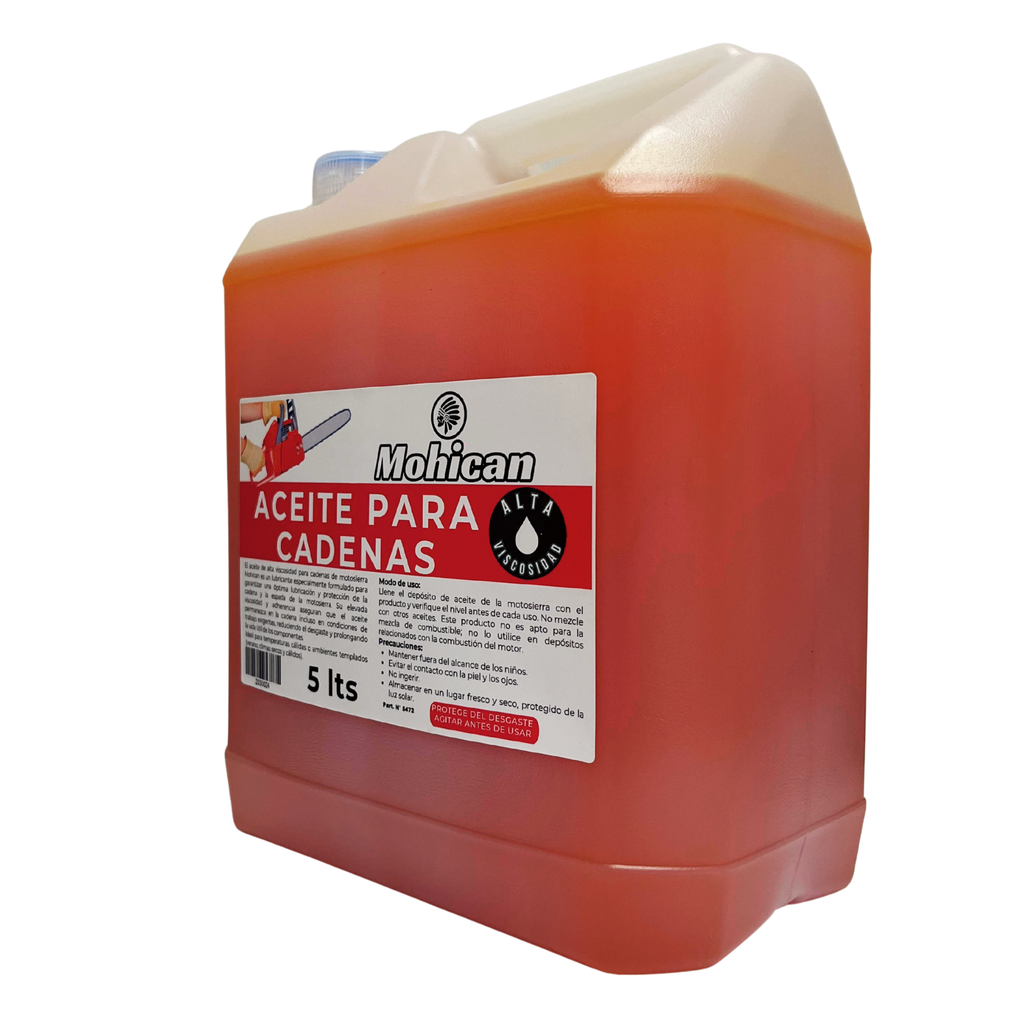 Nuestro Aceite para Cadena Motosierra MOHICAN® bidón 5 Litros, es un producto que no puede faltar en tus trabajos de poda, en tu hogar o de manera más profesional. Mantendrá tu motosierra en un buen estado de lubricación, evitando un desgaste mayor en el sistema de transmisión.
