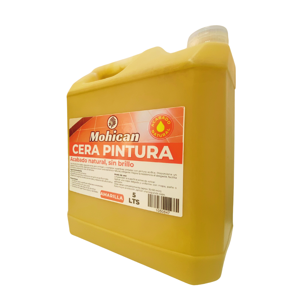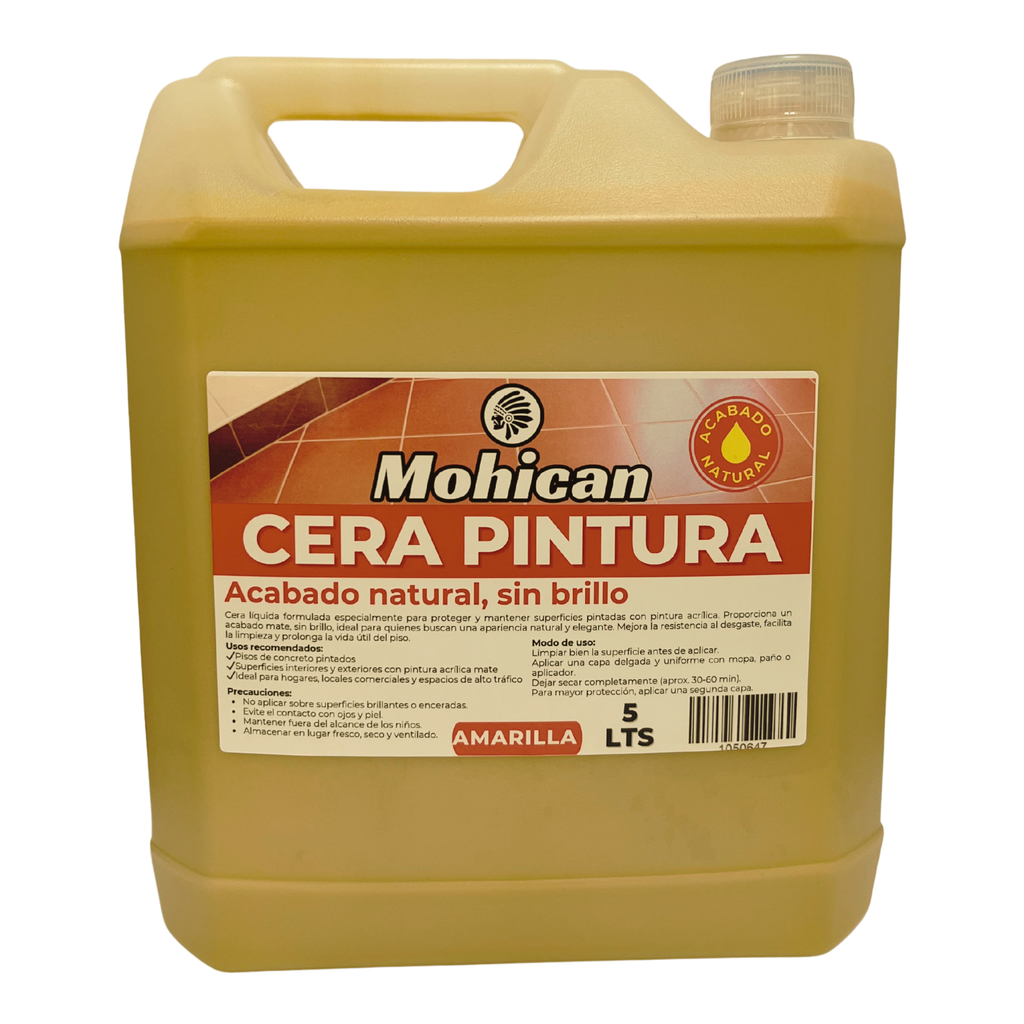 La cera de pintura acrílica para pisos Mohican® es un tipo de recubrimiento que se aplica para proporcionar protección y mejorar su apariencia. Proporciona un acabado mate, sin brillo, ideal para quienes buscan un aspecto natural y elegante. Mejora la resistencia al desgaste. Se utiliza comúnmente en pisos de madera, laminados o de concreto para crear una capa protectora que ayuda a prevenir rayones, manchas y daños causados por el tráfico peatonal y el uso diario. Se aplica fácilmente con una brocha o un rodillo y se seca rápidamente, permitiendo que los pisos estén listos para usar en poco tiempo.